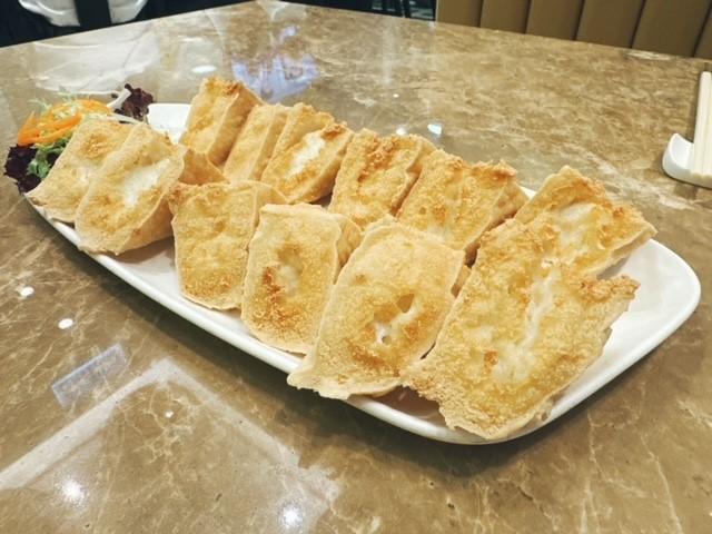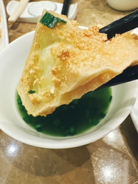 香炸至金黃色,外型似炸魚片頭,點埋個蔥醋汁食,外脆內有豆腐嘅豆香味及嫩滑口感。